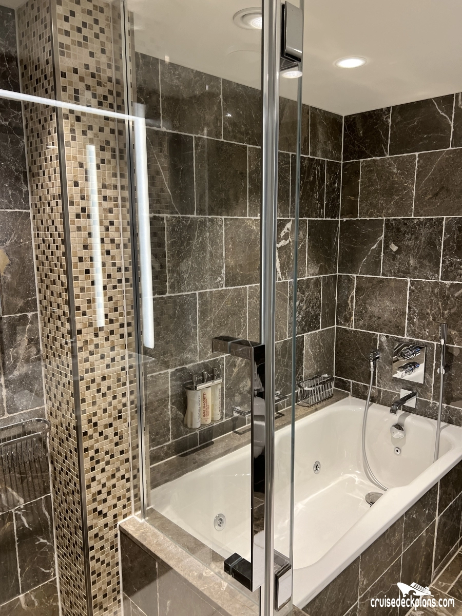 Bathrooms in standard staterooms are approximately 3' x 5'8". Shampoo, conditioner and soap are supplied in suites. Shampoo and soap are supplied in standard staterooms. Showers are European telephone style, adjustable from 1.4 m to 1.9 m, or 6'2", max. clearance height. Someone taller than 6'2" will fit in the shower, but will likely have to duck to get his or her head under the running water. Shower stools and nonslip mats are provided upon request.