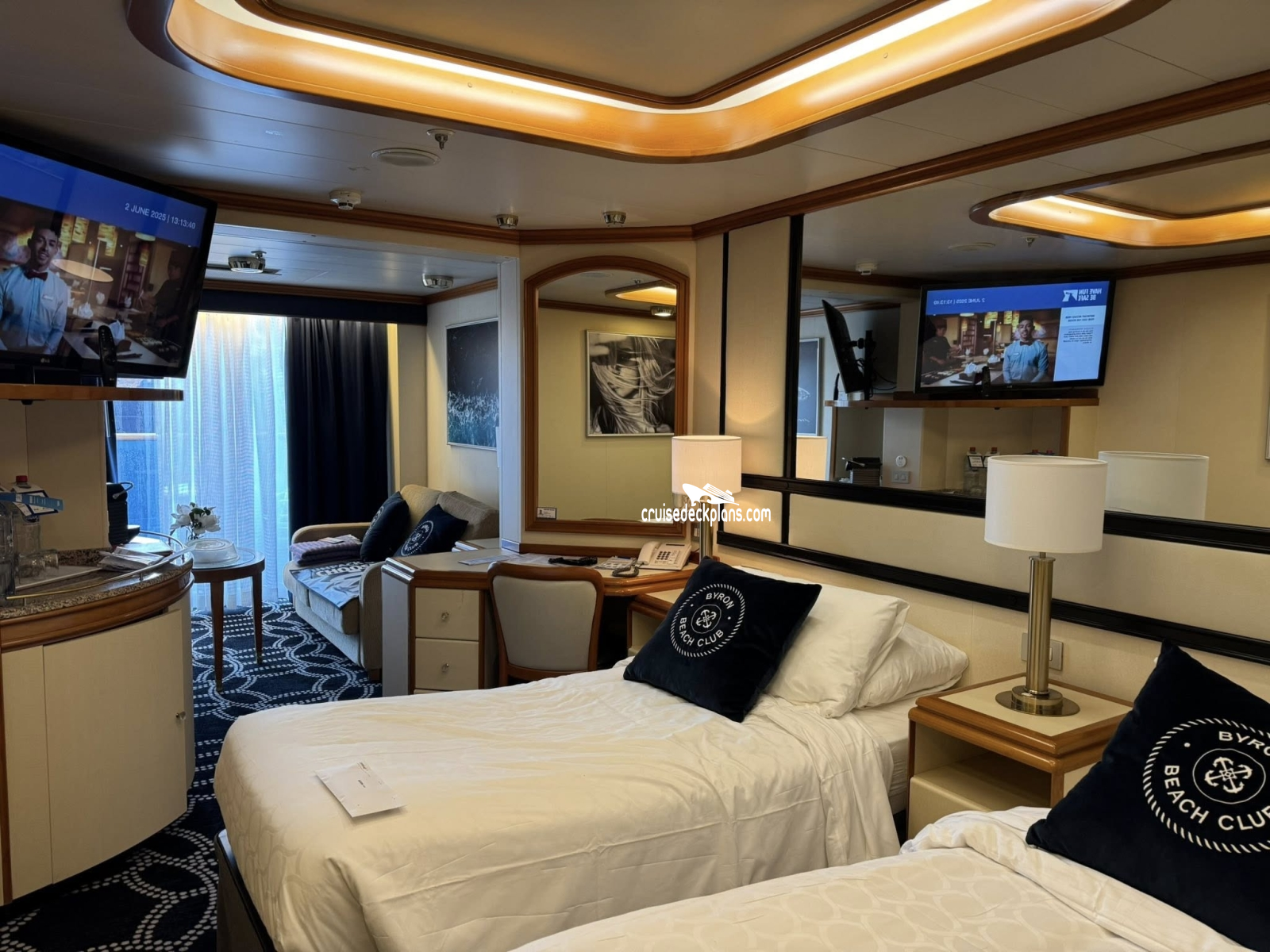 - Bedroom: Two twin beds (convert to king)- Flat-screen TV, vanity table, make-up mirror, hair dryer, walk-in closet with ample storage space, privacy curtain