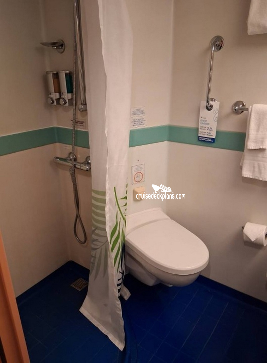 Stateroom 6182 is modified for wheelchair users. The bathroom has a roll-in shower, whirlpool tub, toilet and 1 sink; the suite does not have a walk-in dressing area with a vanity table, sink and chair nor a bidet in the bathroom.Stateroom Cabin Perks