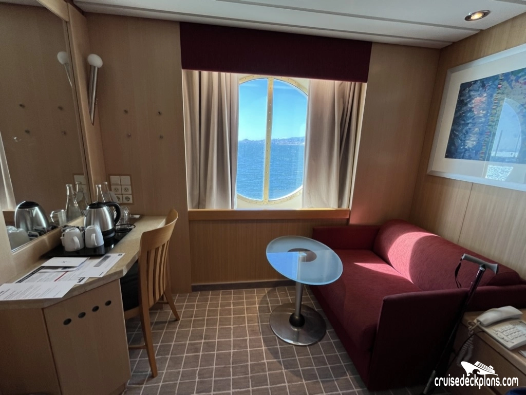 Cabins 8102, 8108, 9094 and 9100 have smaller irregular shaped balcony. Staterooms 8094, 8096, 8111, 8115, 9086 and 9088 have partially obstructed view by a window cleaning platform.Stateroom Cabin Perks