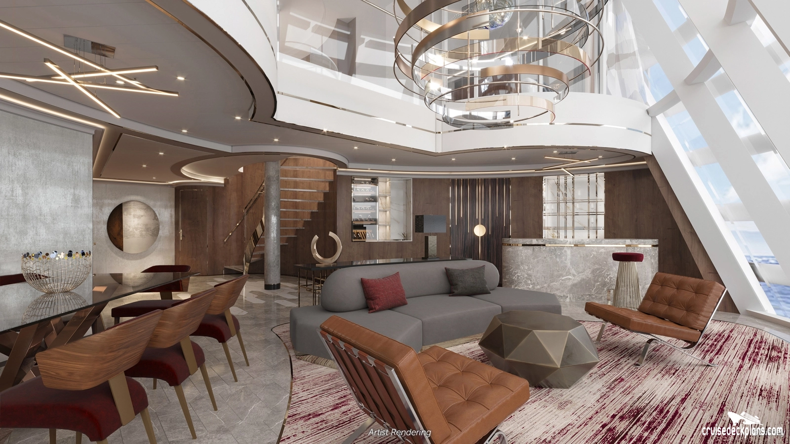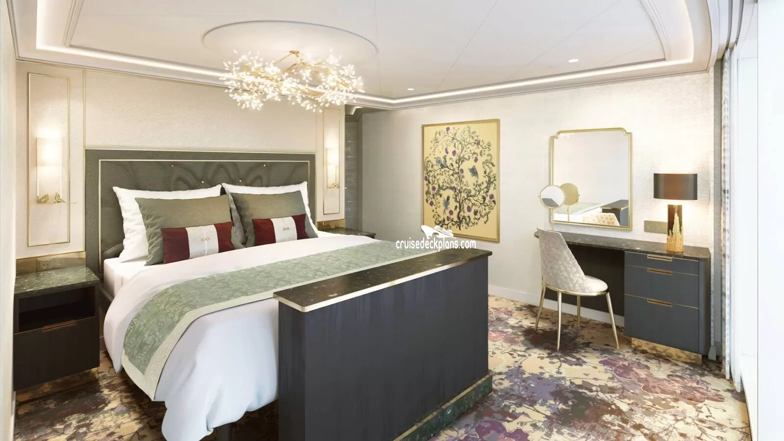 Concierge Service / Priority Check In / Priority Tender Boarding / Dining in the Stateroom / Exclusive Lounge / Priority Dining Reservations / Exclusive Outdoor Lounge / Thick Cotton Robes / Pillow Menu / Sealy Posturepedic Euro-top mattress / Frette 100% Egyptian cotton linens / 2 LCD 42 inch HD flat screen Tvs / Ipod docking station / Enhanced line of H20 Plus spa products / Media library / Pre-arrival concierge services /Amenities are subject to change without notice.
