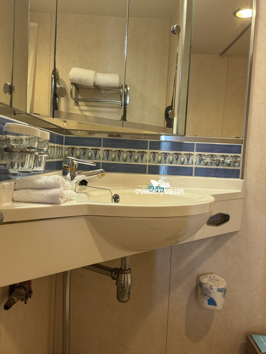 Bathrooms in standard staterooms are approximately 3' x 5'8". Shampoo, conditioner and soap are supplied in suites. Shampoo and soap are supplied in standard staterooms. Showers are European telephone style, adjustable from 1.4 m to 1.9 m, or 6'2", max. clearance height. Someone taller than 6'2" will fit in the shower, but will likely have to duck to get his or her head under the running water. Shower stools and nonslip mats are provided upon request.
