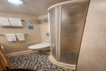 Bathrooms in standard staterooms are approximately 3' x 5'8". Shampoo, conditioner and soap are supplied in suites. Shampoo and soap are supplied in standard staterooms. Showers are European telephone style, adjustable from 1.4 m to 1.9 m, or 6'2", max. clearance height. Someone taller than 6'2" will fit in the shower, but will likely have to duck to get his or her head under the running water. Shower stools and nonslip mats are provided upon request.