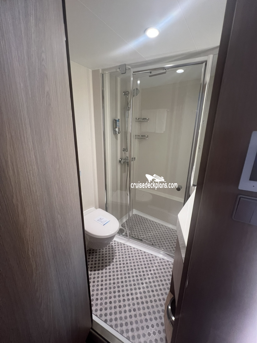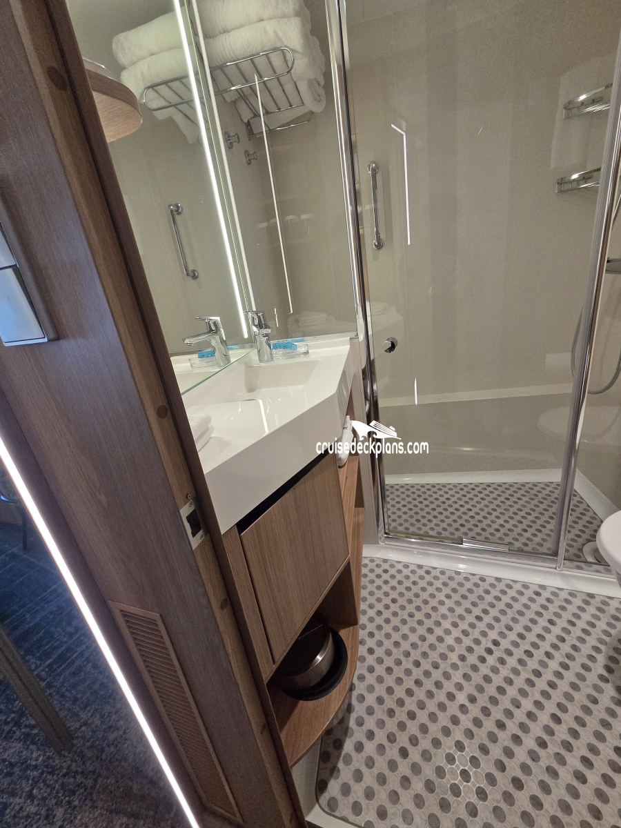 - Two-decks-high stateroom with panoramic views- Main level features a bedroom with closet and vanity