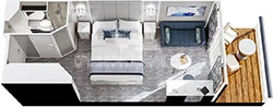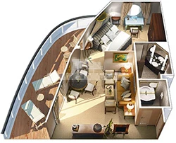 Butler Service / Concierge Service / Priority Check In / Priority Luggage Delivery / Dining in the Stateroom / Complimentary Shoe Shine / Welcome Champagne / Complimentary Mini-bar Setup / Exclusive Lounge / Priority Dining Reservations / Exclusive Outdoor Lounge / Complimentary Laundry / Thick Cotton Robes / King-size Prestige tranquility bed with 1,000 thread count linens / Refridgerated mini-bar with free and unlimited soft drinks and bottled water / Bulgari toiletries / Full-size bathtub / Signature belgian chocolates with nightly turndown service / DVD player / Wifi / Personalized stationary / Use of laptop computer with internet plan discounts / IPad on request / Complimentary tote bag / Cashmere lap blankets / Entertainment system and media library / Gourmet evening canapes / Bulgari gift set / Choice of daily newspaper /Amenities also include expanded room-service menu, evening canapes, assistance with unpacking and packing, last minute luggage collection, slippers, DVD library, priority specialty restaurant and shore excursion reservations.