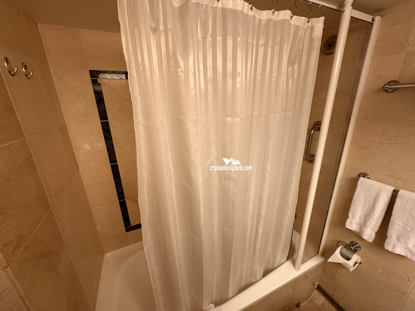 Standard cabin amenities /Bathrooms in standard staterooms are approximately 3' x 5'8". Shampoo, conditioner and soap are supplied in suites. Shampoo and soap are supplied in standard staterooms. Showers are European telephone style, adjustable from 1.4 m to 1.9 m, or 6'2", max. clearance height. Someone taller than 6'2" will fit in the shower, but will likely have to duck to get his or her head under the running water. Shower stools and nonslip mats are provided upon request.