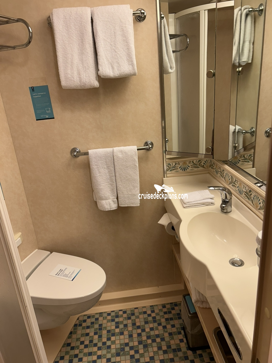 Bathrooms in standard staterooms are approximately 3' x 5'8". Shampoo, conditioner and soap are supplied in suites. Shampoo and soap are supplied in standard staterooms. Showers are European telephone style, adjustable from 1.4 m to 1.9 m, or 6'2", max. clearance height. Someone taller than 6'2" will fit in the shower, but will likely have to duck to get his or her head under the running water. Shower stools and nonslip mats are provided upon request.