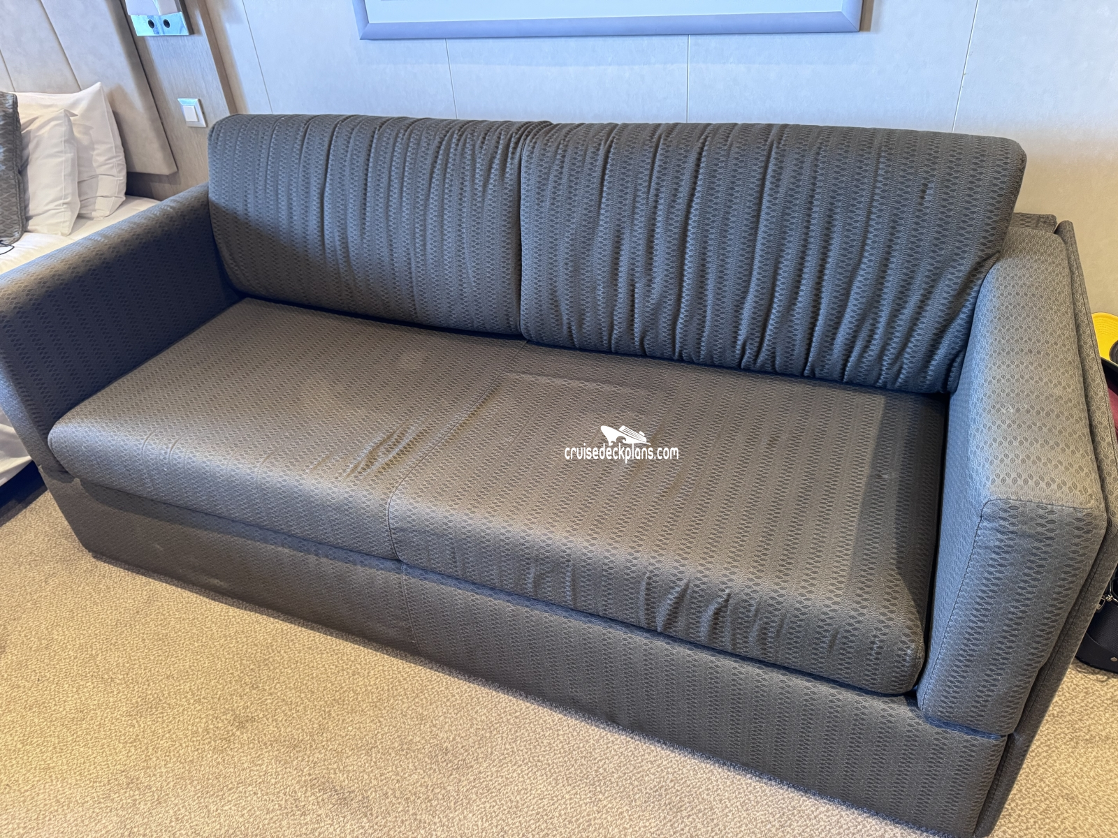 Diagram shown above represents S3 suites on deck 9 (except for aft facing suites) and those balconies are extra long and the balcony itself is about 172 square feet. Cabins with angled balconies are approx 215 square feet plus 80 square foot balcony.In some cabins the bed will be close to the balcony door. In other cabins the couch will be close to the balcony door.