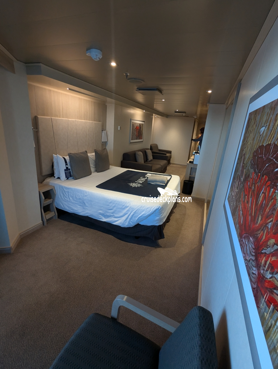Category SD3 Grand Suites (11001, 12001, 14001) located in the forward middle are longer with a second bath with toilet and shower and a second bedroom with two twins that can be joined as double. There will also be a glass enclosed porch on the deck to protect against wind while ship is moving forward.These suites vary in size but average reported size is 398 square feet with 200 square foot balcony area. Category SX sleeps up to 5.