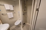 Bathrooms in standard staterooms are approximately 3' x 5'8". Shampoo, conditioner and soap are supplied in suites. Shampoo and soap are supplied in standard staterooms. Showers are European telephone style, adjustable from 1.4 m to 1.9 m, or 6'2", max. clearance height. Someone taller than 6'2" will fit in the shower, but will likely have to duck to get his or her head under the running water. Shower stools and nonslip mats are provided upon request.