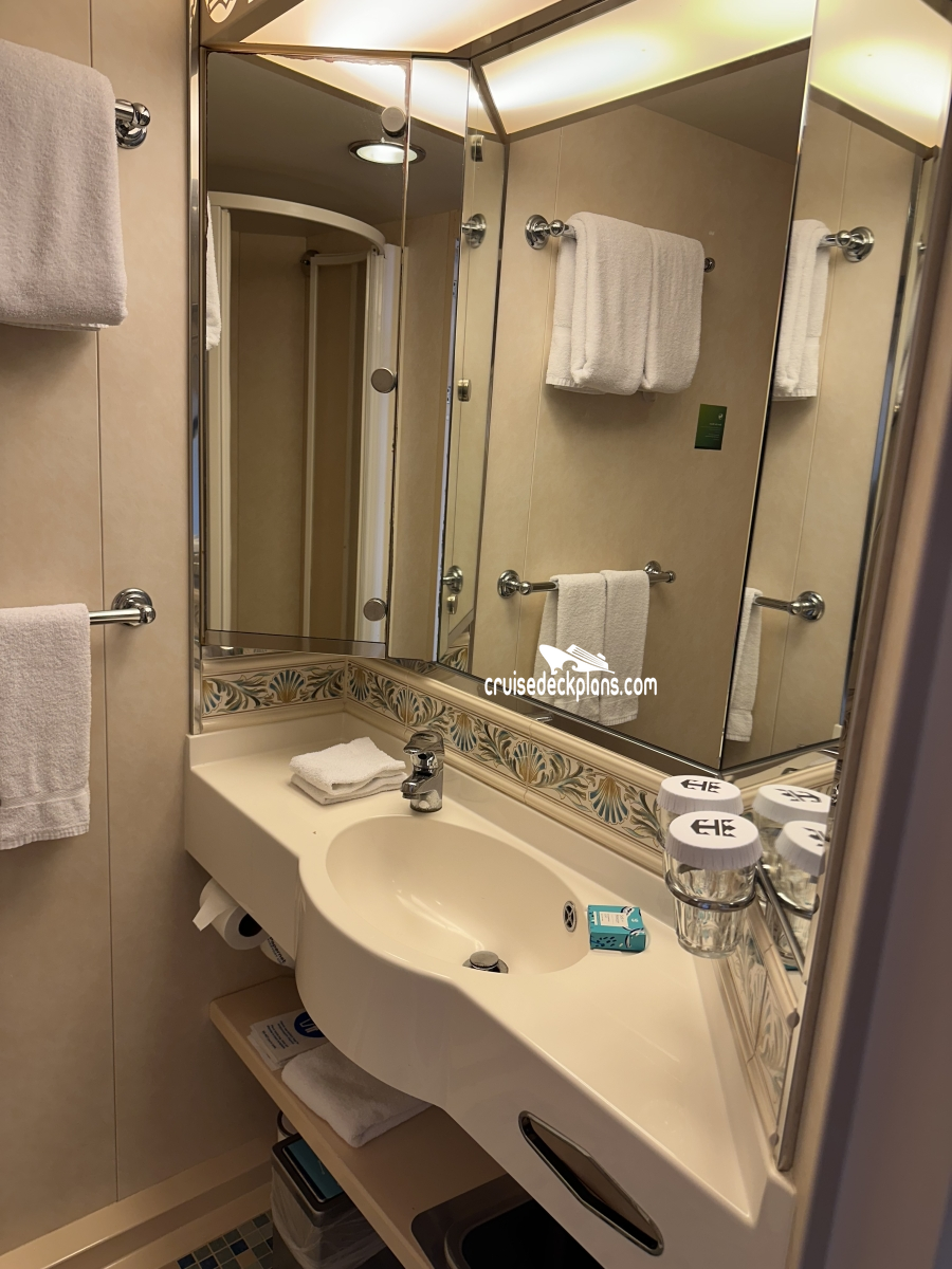 Concierge Service / Priority Check In / Priority Luggage Delivery / Priority Debarkation / Priority Tender Boarding / Reserved Show Seats / Dining in the Stateroom / Exclusive Lounge / Exclusive Full Breakfast Restaurant / Exclusive Lunch Restaurant / Thick Cotton Robes / Pillow Menu / VIP pool deck seating / Private breakfast and lunch seating in specialty restaurants on Voyager and Freedom Class ships / Mattel board games available to order for in-room entertainment for the kids / Complimentary pressing service on formal night. /Bathrooms in standard staterooms are approximately 3' x 5'8". Shampoo, conditioner and soap are supplied in suites. Shampoo and soap are supplied in standard staterooms. Showers are European telephone style, adjustable from 1.4 m to 1.9 m, or 6'2", max. clearance height. Someone taller than 6'2" will fit in the shower, but will likely have to duck to get his or her head under the running water. Shower stools and nonslip mats are provided upon request.
