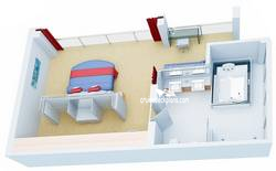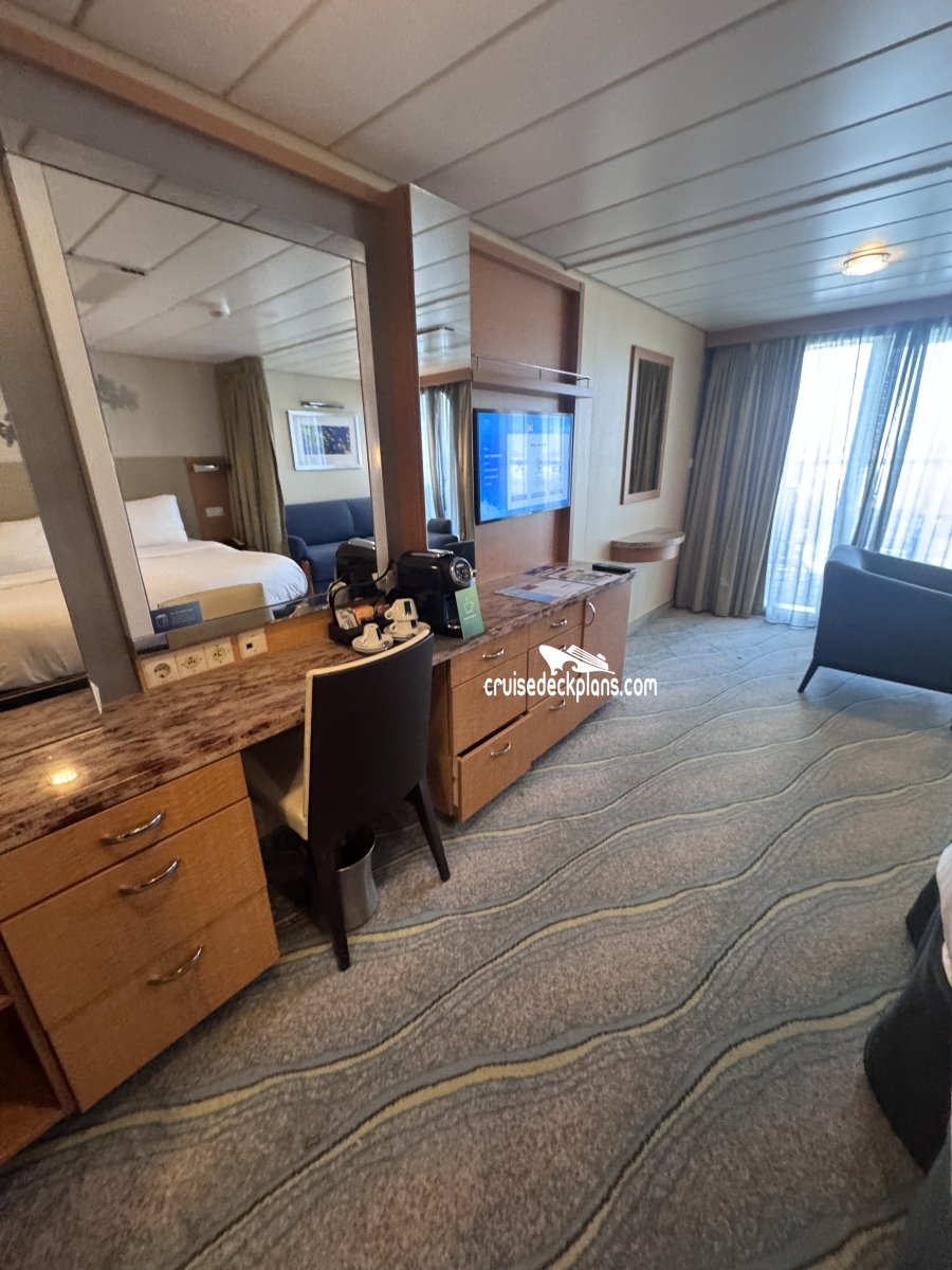 - As well as a spacious living area with desk, drawer space, vanity, chairs