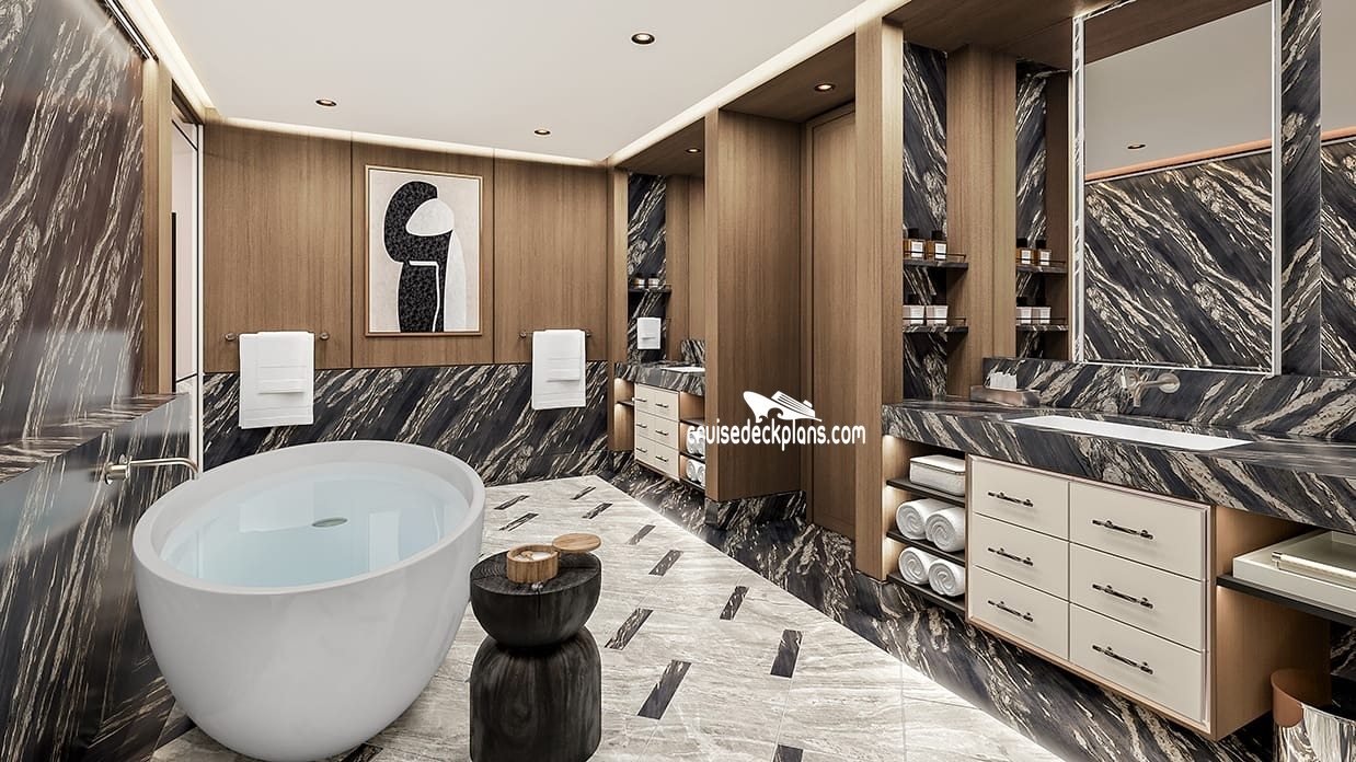 Butler Service / Concierge Service / Priority Check In / Priority Luggage Delivery / Dining in the Stateroom / Complimentary Shoe Shine / Welcome Champagne / Complimentary Mini-bar Setup / Exclusive Lounge / Priority Dining Reservations / Exclusive Outdoor Lounge / Complimentary Laundry / Thick Cotton Robes / King-size Prestige tranquility bed with 1,000 thread count linens / Refridgerated mini-bar with free and unlimited soft drinks and bottled water / Bulgari toiletries / Full-size bathtub / Signature belgian chocolates with nightly turndown service / DVD player / Wifi / Personalized stationary / Use of laptop computer with internet plan discounts / IPad on request / Complimentary tote bag / Cashmere lap blankets / Entertainment system and media library / Gourmet evening canapes / Bulgari gift set / Choice of daily newspaper /Amenities are subject to change without notice.