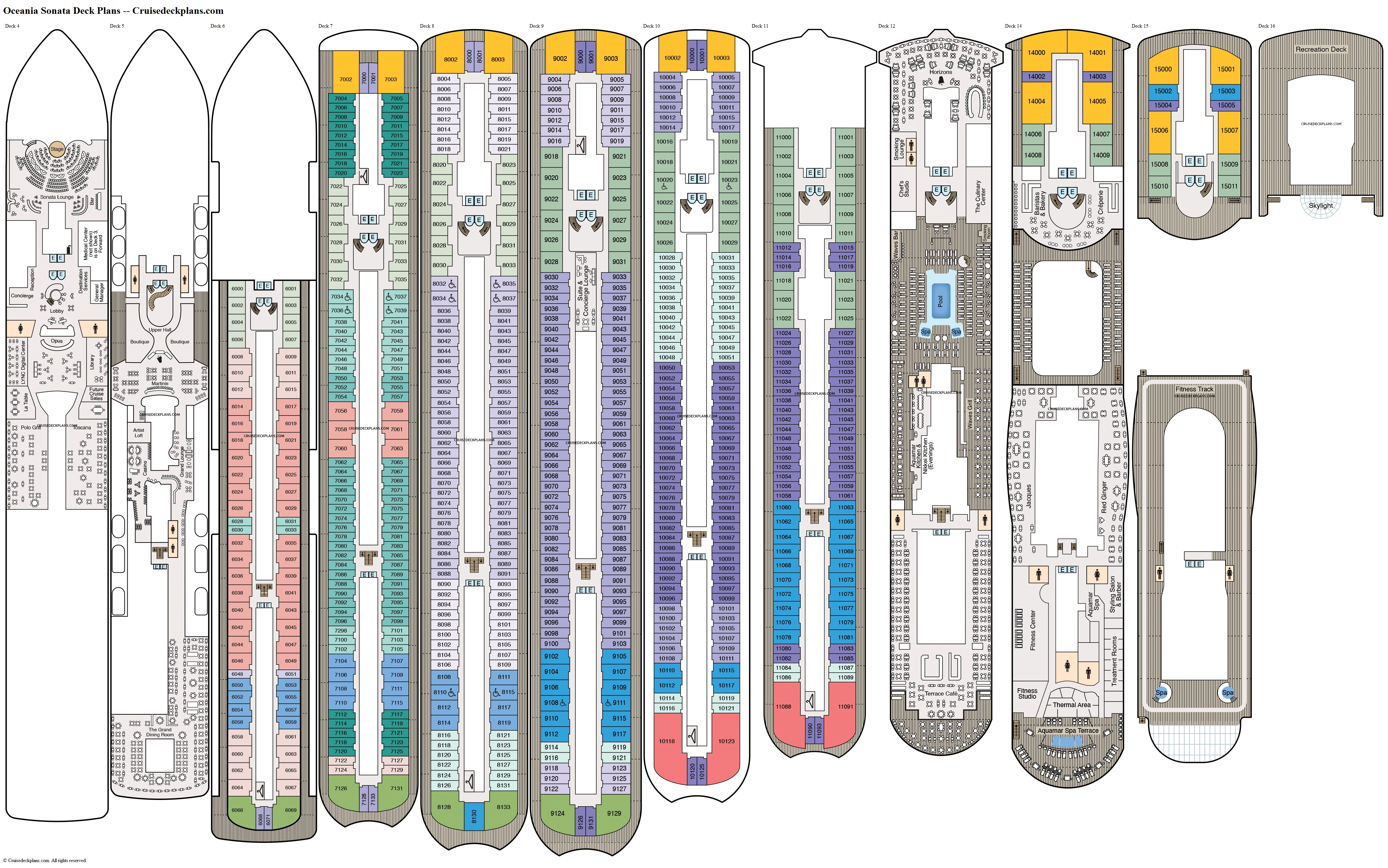 Built in 2027, the Oceania Cruises Oceania Sonata internal volume is 86K tons and has 669 staterooms for up to 1606 passengers served by crew. There are 15 passenger decks, 8 with cabins. You can expect a space ratio of 54 gross tons per passenger on this ship. On this page are the current deck plans for Oceania Sonata showing deck plan layouts, public venues and all the types of cabins including pictures and videos.