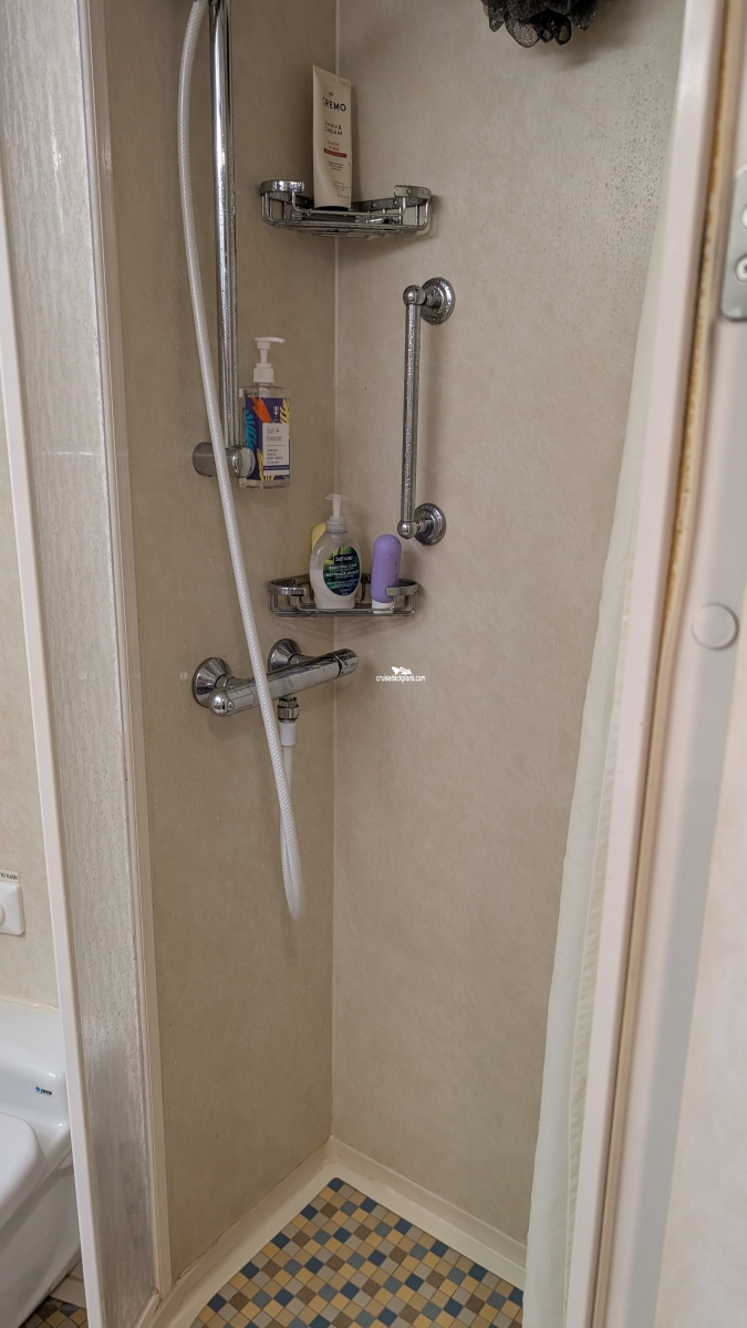 Bathrooms in standard staterooms are approximately 3' x 5'8". Shampoo, conditioner and soap are supplied in suites. Shampoo and soap are supplied in standard staterooms. Showers are European telephone style, adjustable from 1.4 m to 1.9 m, or 6'2", max. clearance height. Someone taller than 6'2" will fit in the shower, but will likely have to duck to get his or her head under the running water. Shower stools and nonslip mats are provided upon request.