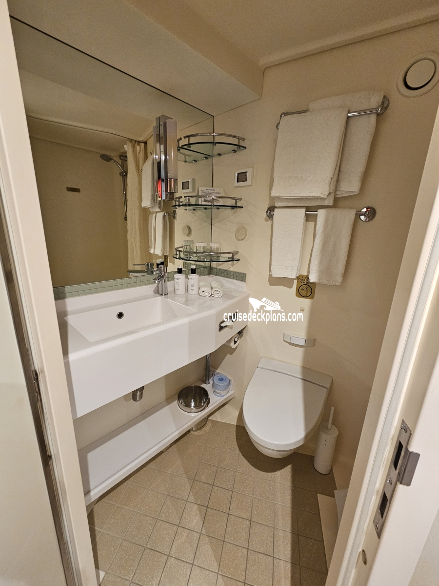 Priority Check In / Priority Debarkation / Priority Tender Boarding / Dining in the Stateroom / Afternoon Canapes / Afternoon Tea / Welcome Champagne / Exclusive Lounge / Exclusive Full Breakfast Restaurant / Priority Dining Reservations / Complimentary Laundry / Complimentary Photo(s) / Thick Cotton Robes / Pillow Menu / Upgraded balcony furniture including loungers, dining tables and chairs / complimentary mini-bar set-up / CD/DVD player with access to complimentary DVD library / Pillow-top mattress / Egyptian cotton high thread bed linens / fresh orchid in stateroom / upgraded bathroom amenities including bath salts and soothing gel eye mask / private lounge at the conclusion of the cruise / priority shore excursion reservations / priority line at service desk / use of Lotus Spa Thermal Suite / exclusive suite breakfast in Sabatinis (includes Mimosa) / exclusive elite lounge with hors d'oeuvres / extended room service menu with full menu offerings / complimentary cover charge for specialty restarants on embarkation evening / Chefs welcome goodies on embarkation day / complimentary flower corsage and boutonniere on first formal night / turndown service includes chocolate dipped stawberries or wrapped chocolates /Balconies may have either solid steel or toughened glass railing. Amenities also include luxury towels, massage shower heads, complimentary bathroom amenities (shampoo, conditioner, body lotion, bath gel, plus new lip balm, gel eye mask, bath salts and loofah mitts), Complimentary mini-bar - one-time set up,, Halo light magnifying vanity mirrors on vanity, complimentary Princess tote bag, complimentary dry cleaning service,and complimentary internet access in on-board Internet Cafes (wireless internet connection not included). Upgraded room amenities including: ice bucket and tray, leather wallet for cruise card, high quality pen, combined clothes brush, lint remover and shoe horn, shoe cleaning mitt, sewing kit, white cloth laundry bag,black cloth shoe shining bag, umbrella and slippers for use during the cruise.
