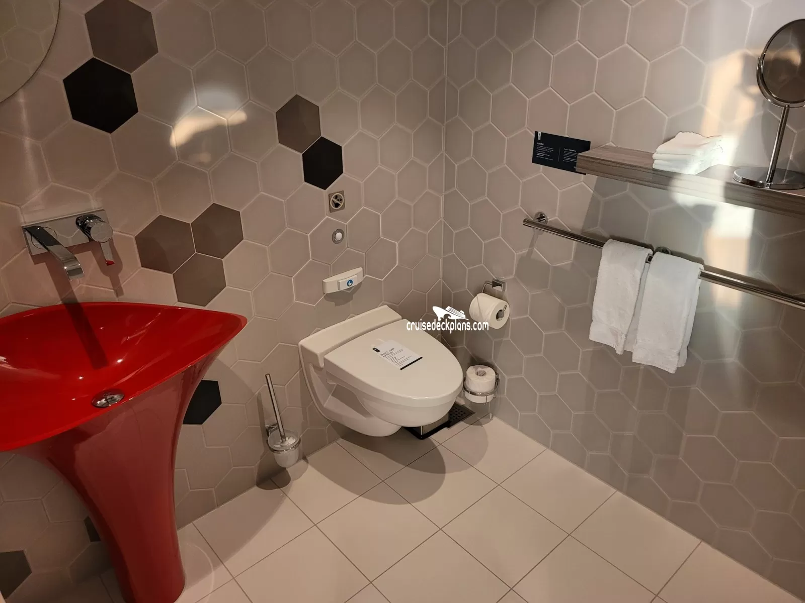 Bathrooms in standard staterooms are approximately 3' x 5'8". Shampoo, conditioner and soap are supplied in suites. Shampoo and soap are supplied in standard staterooms. Showers are European telephone style, adjustable from 1.4 m to 1.9 m, or 6'2", max. clearance height. Someone taller than 6'2" will fit in the shower, but will likely have to duck to get his or her head under the running water. Shower stools and nonslip mats are provided upon request.