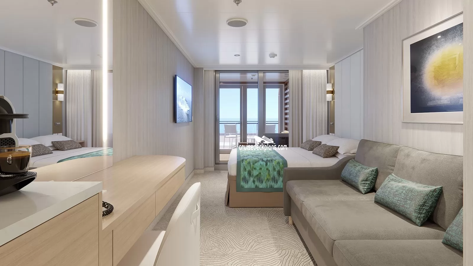 - Some cabins have bed close to the balcony, others have sofa close to the balcony.
