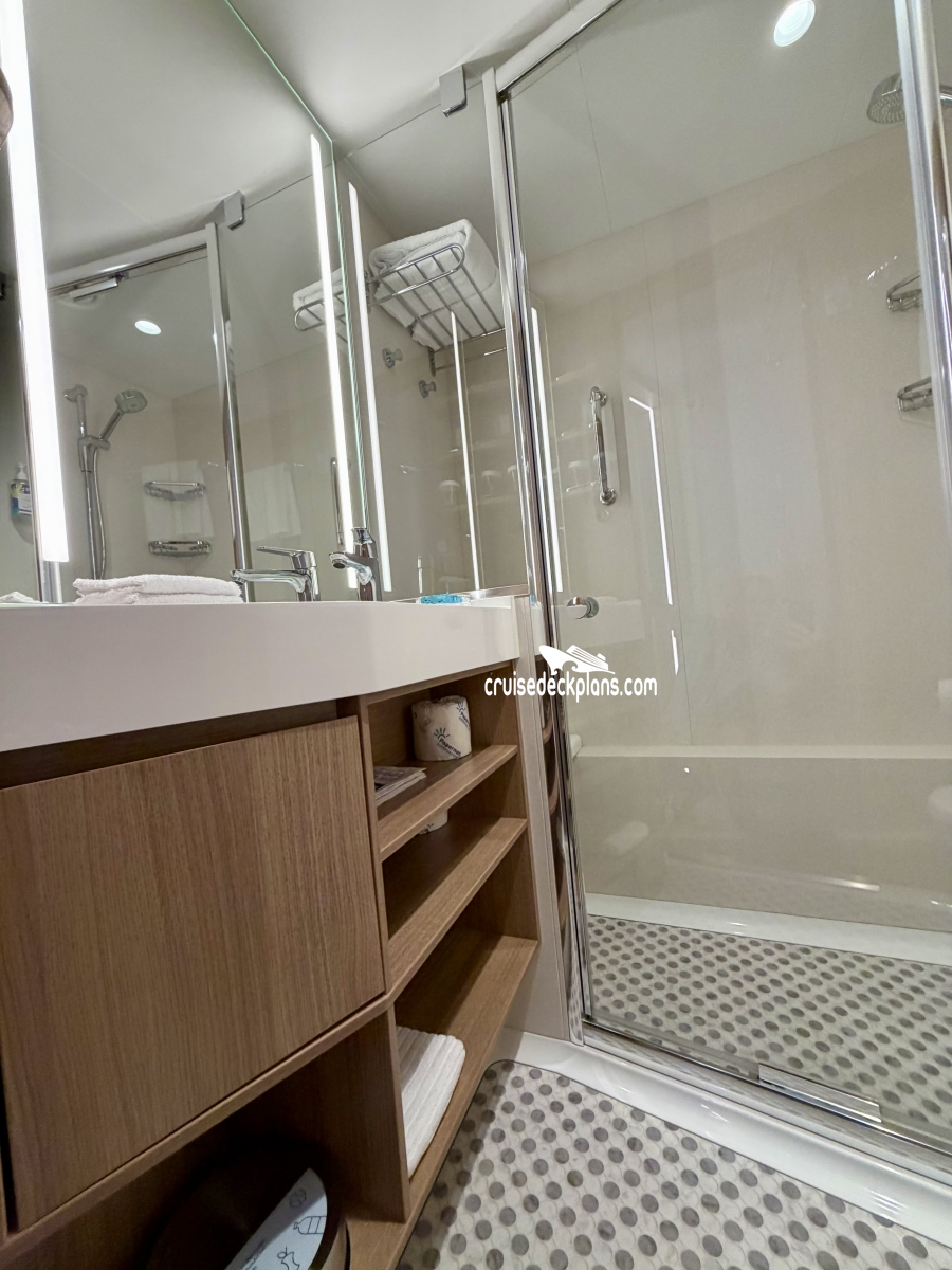 - Two-decks-high stateroom with panoramic views- Main level features a bedroom with closet and vanity
