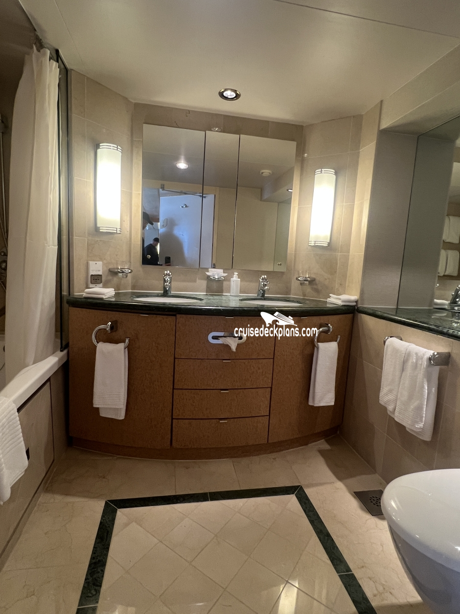 Concierge Service / Priority Check In / Priority Luggage Delivery / Priority Debarkation / Priority Tender Boarding / Reserved Show Seats / Dining in the Stateroom / Exclusive Lounge / Exclusive Full Breakfast Restaurant / Thick Cotton Robes / Pillow Menu / Complimentary 24-hour room service / Personal key to the Concierge Club / Suite Cocktail Party / Complimentary pre-dinner cheese plate on first formal evening / Complimentary petits four plate on the second formal or final evening of cruise / Welcome amenities include a fruit plate and bottle of Chandon, still water, and sparkling water. /Bathrooms in standard staterooms are approximately 3' x 5'8". Shampoo, conditioner and soap are supplied in suites. Shampoo and soap are supplied in standard staterooms. Showers are European telephone style, adjustable from 1.4 m to 1.9 m, or 6'2", max. clearance height. Someone taller than 6'2" will fit in the shower, but will likely have to duck to get his or her head under the running water. Shower stools and nonslip mats are provided upon request.