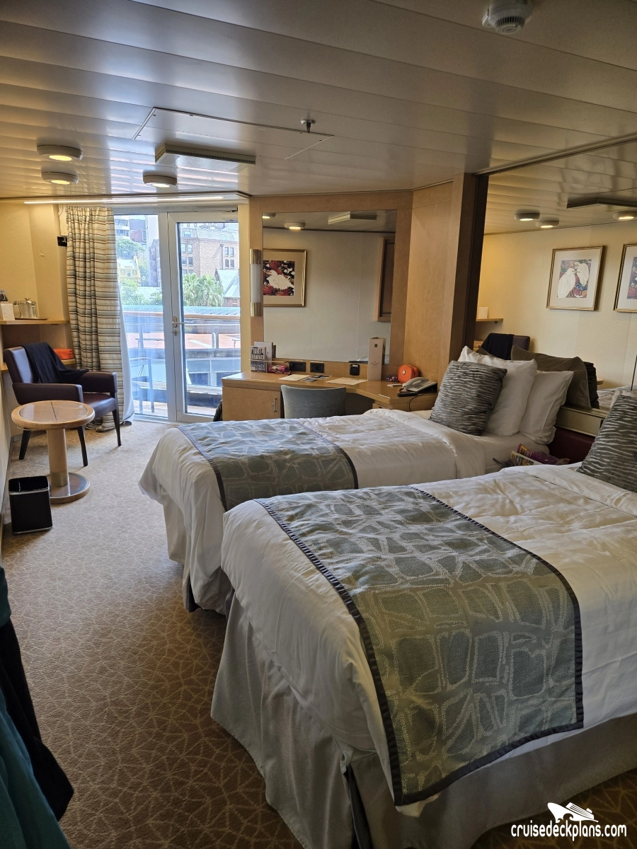 Cabin size ranges from 170 to 194 square feet. Category HH and H is fully obstructed. Category G is partially obstructed. Some VH, VH, VE verandahs have solid steel railings.Stateroom Cabin Perks