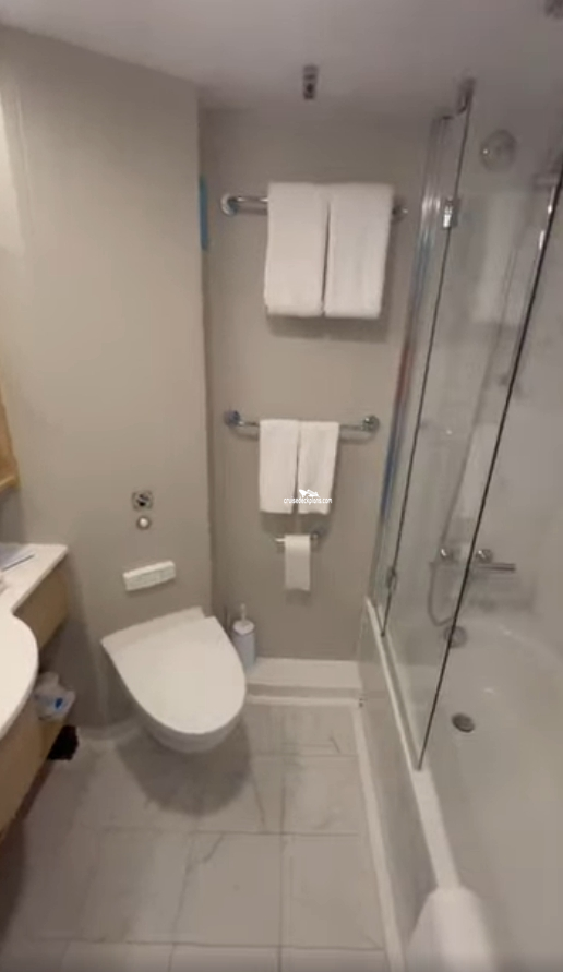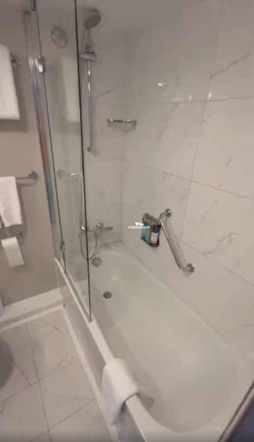 Bathrooms in standard staterooms are approximately 3' x 5'8". Shampoo, conditioner and soap are supplied in suites. Shampoo and soap are supplied in standard staterooms. Showers are European telephone style, adjustable from 1.4 m to 1.9 m, or 6'2", max. clearance height. Someone taller than 6'2" will fit in the shower, but will likely have to duck to get his or her head under the running water. Shower stools and nonslip mats are provided upon request.