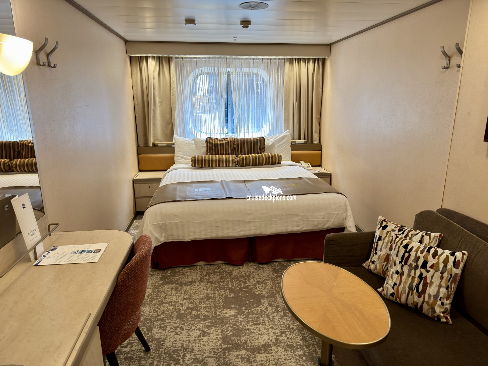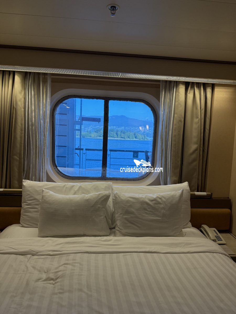 Category G has two portholes. Category HH is fully obstructed. Category H is partially obstructed. Cabins on deck 3 have windows looking out onto promenade deck and people walking by can view into the cabin when lights are on in cabin. In 2018 tubs were removed from the following cabins: Lower Promenade Deck: D3331 - D3370, Main Deck: C2564 - C2647