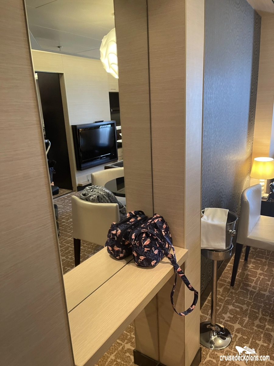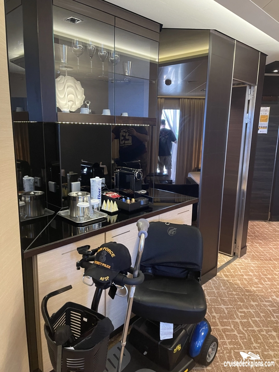 Butler Service / Concierge Service / Priority Check In / Priority Debarkation / Priority Tender Boarding / Dining in the Stateroom / Welcome Champagne / Exclusive Lounge / Exclusive Pool / Exclusive Outdoor Lounge / Thick Cotton Robes / Pillow Menu / Espresso & Cappuccino machine / Special suite menus / Bliss collection pillow-top mattress / Treats delivered to door every night / Courtyard valet / Escort to suite /