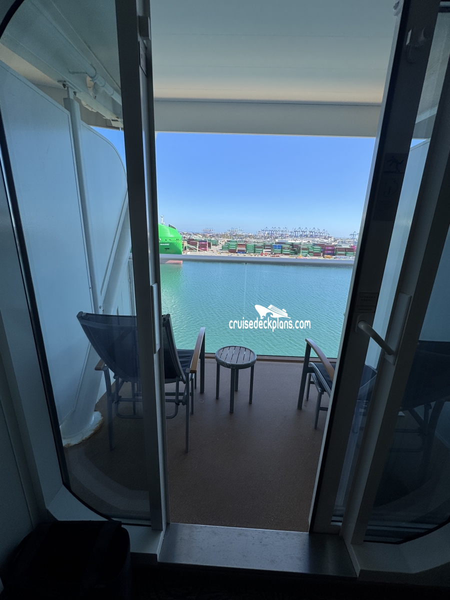 2C (was D1) balconies range from 55 to 119 square feet. Cabins 6254, 6258, 6654, 6658, 7254, 7258, 7654, 7658 have a chair instead of sofa and are 177 square feet with 82 square feet balconies. Category 1E and 2E (was DO) and 2F (was SB) is obstructed by view of top of lifeboat. Forward category 2E (was DO) on deck 7 and deck 8 is obstructed by steel frame that forms porthole opening. Some cabins have sofa near the balcony and others have bed near the balcony.