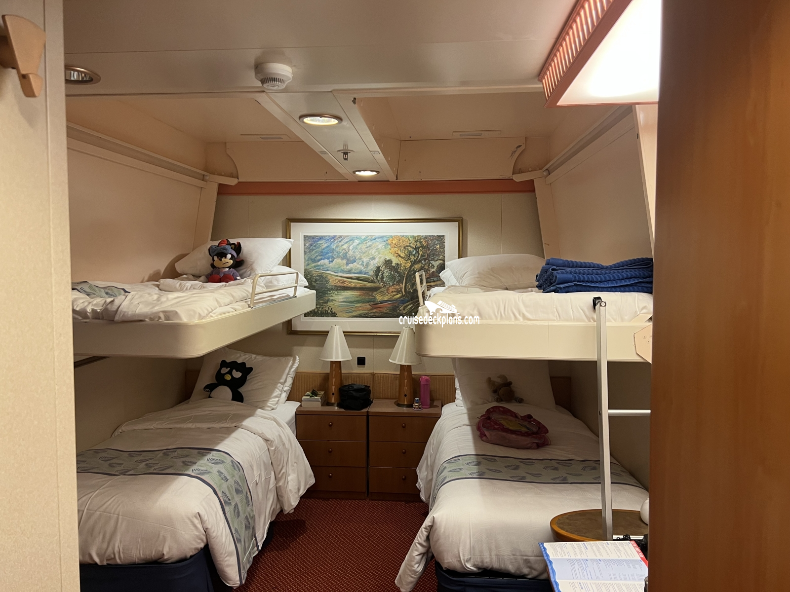 Category 1A is only 160 square feet and has only upper and lower beds. Cabin 1111, 1247, 1249, 1255, 1257 have 2 single beds that can be pushed together.