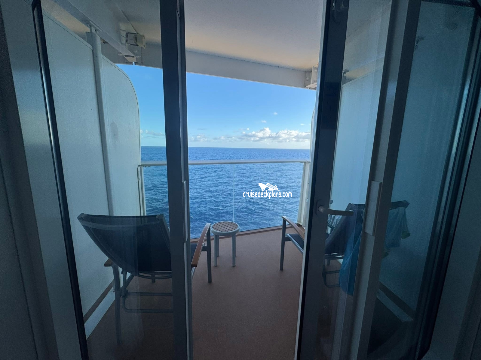 2C (was D1) balconies range from 55 to 119 square feet. Cabins 6254, 6258, 6654, 6658, 7254, 7258, 7654, 7658 have a chair instead of sofa and are 177 square feet with 82 square feet balconies. Category 1E and 2E (was DO) and 2F (was SB) is obstructed by view of top of lifeboat. Forward category 2E (was DO) on deck 7 and deck 8 is obstructed by steel frame that forms porthole opening. Some cabins have sofa near the balcony and others have bed near the balcony.