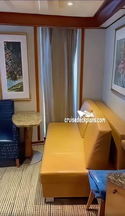This cabin features a wrap around balcony. Staterooms 4228, 4237, 6260, 6329, 7298, 7347 ,8268 and 8273 feature a separate bedroom from sitting area with another LCD television and walk-in dressing area with vanity table and chair.