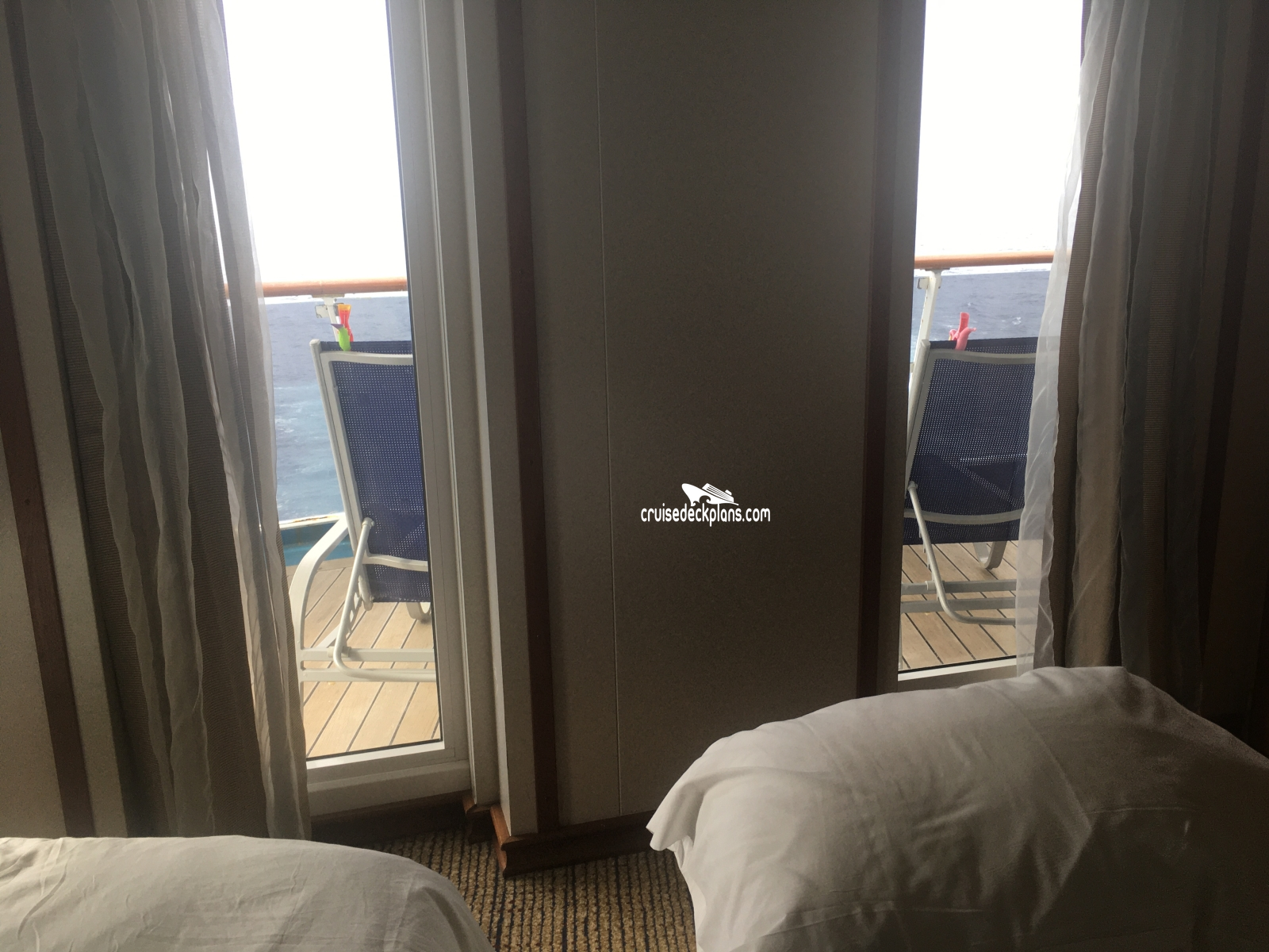 This cabin features a wrap around balcony. Staterooms 4228, 4237, 6260, 6329, 7298, 7347 ,8268 and 8273 feature a separate bedroom from sitting area with another LCD television and walk-in dressing area with vanity table and chair.