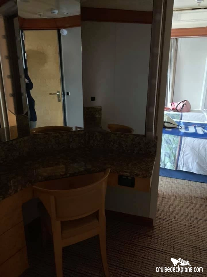 This cabin features a wrap around balcony. Staterooms 4228, 4237, 6260, 6329, 7298, 7347 ,8268 and 8273 feature a separate bedroom from sitting area with another LCD television and walk-in dressing area with vanity table and chair.