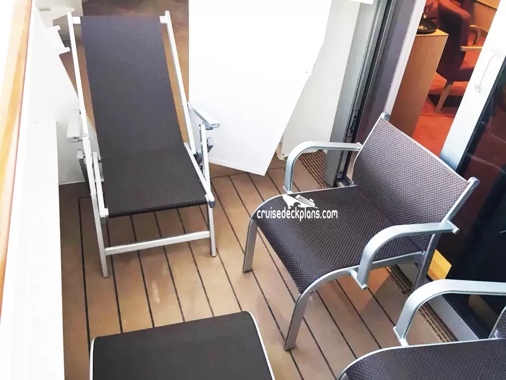 - Corner Grand Suites have small side balcony and porthole window overlooking bow of ship.