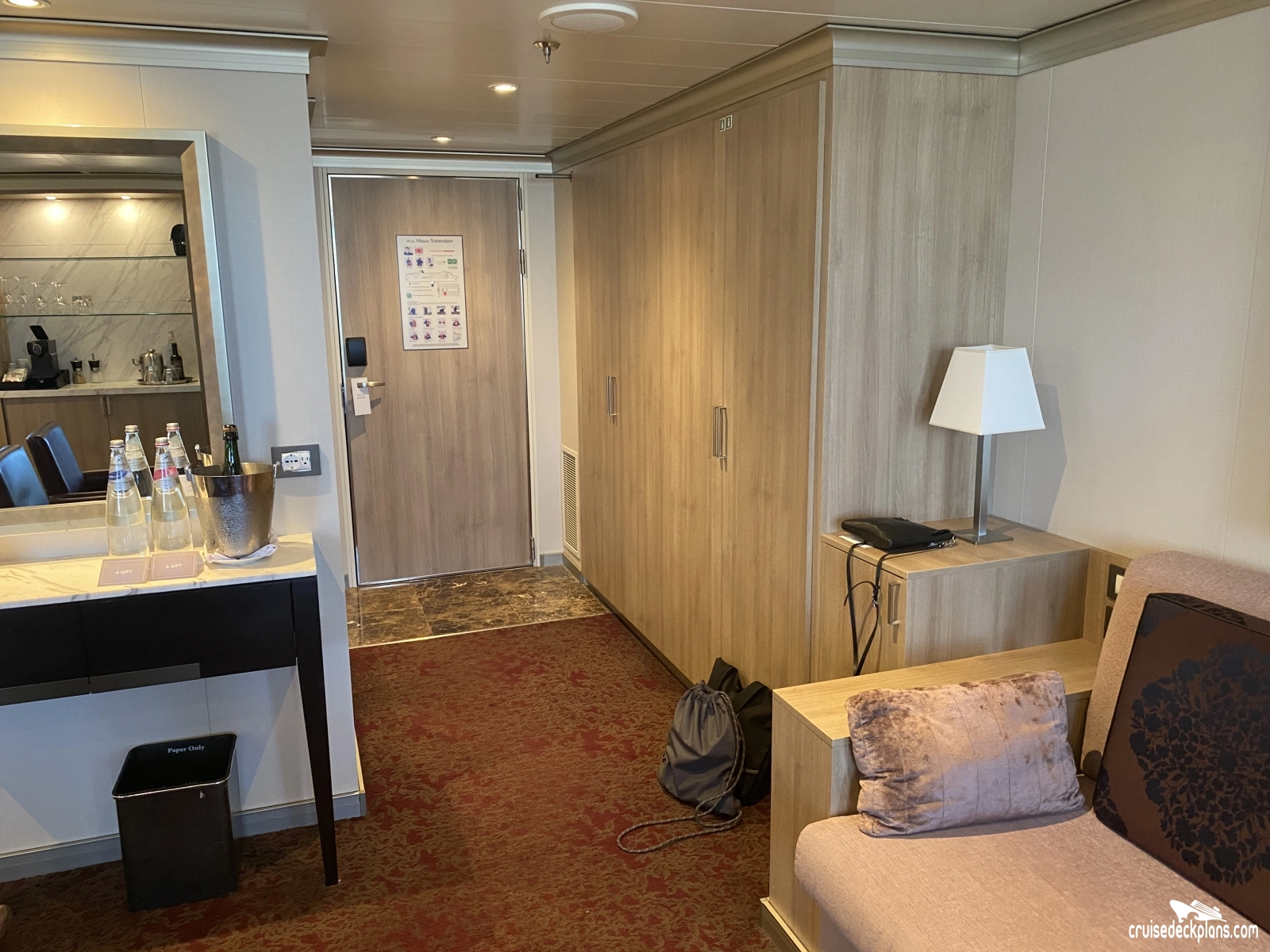 Concierge Service / Priority Check In / Priority Debarkation / Priority Tender Boarding / Afternoon Canapes / Afternoon Tea / Complimentary Shoe Shine / Welcome Champagne / Exclusive Lounge / Exclusive Full Breakfast Restaurant / Priority Dining Reservations / Complimentary Laundry / Thick Cotton Robes / Pillow Menu / Signature Mariner's Dream bed with plush euro-top mattress and finely woven cotton linens / Lighted magnifying mirrors / Massage showerheads / Salon-quality hair dryer / Elemis Aromapure bath products / Flat-panel TV and DVD player / complimentary DVD library / Personalized cruise stationary / Umbrella & binocular usage / Gorgeous corsages and boutonnieres for the first formal night / Cocktail party with ship's officers / Premium duvet / Complimentary bottled water at embarkation / Bose docking station / Complimentary mimosas with in-suite breakfast / In-suite coffee maker and espresso machine. /