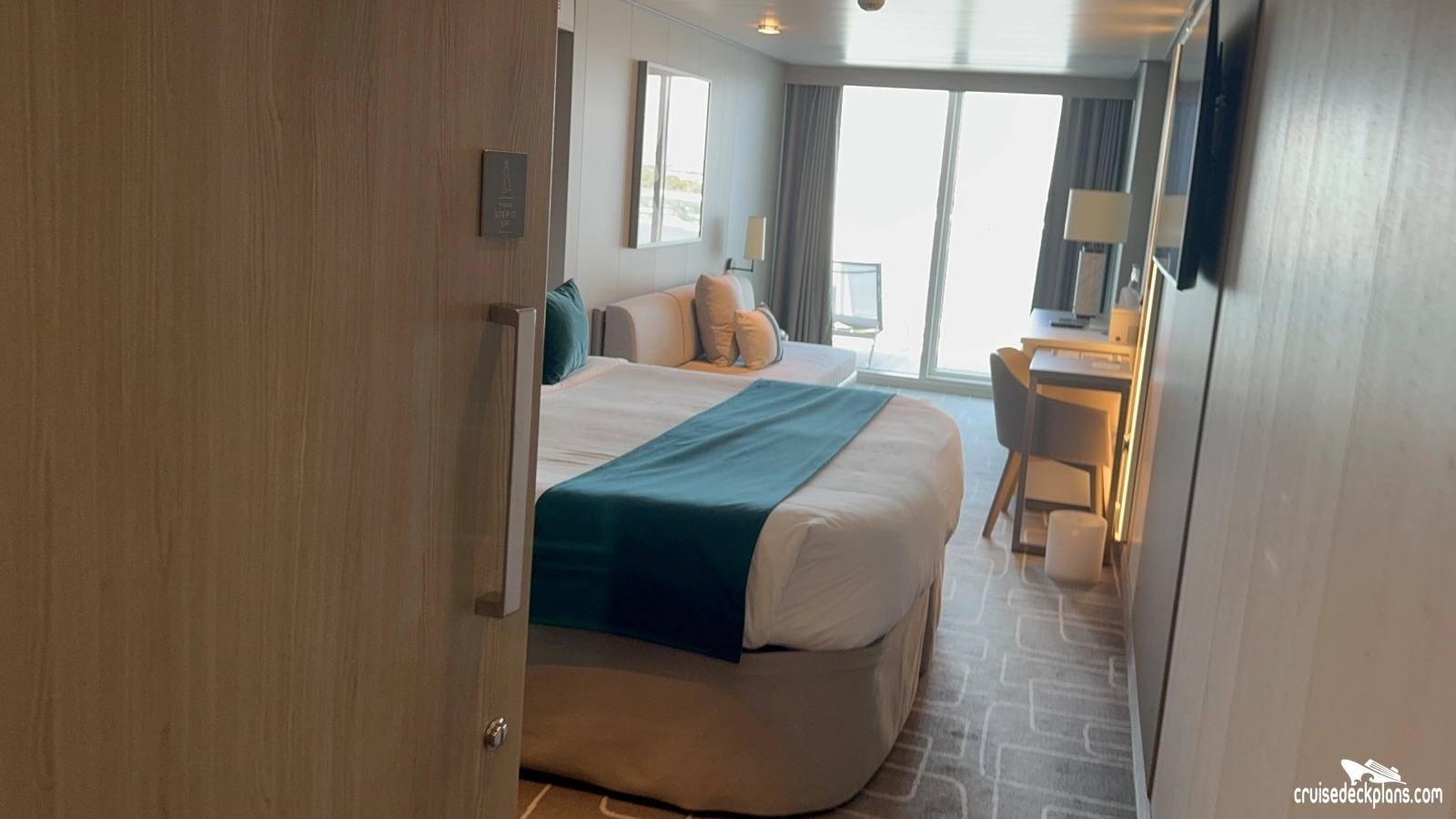 Aft Sunset Veranda cabins are 228 square foot plus a average of 89 square foot balcony. Most forward verandas have a large porthole opening which obstructs the view from the balcony and cabin.
