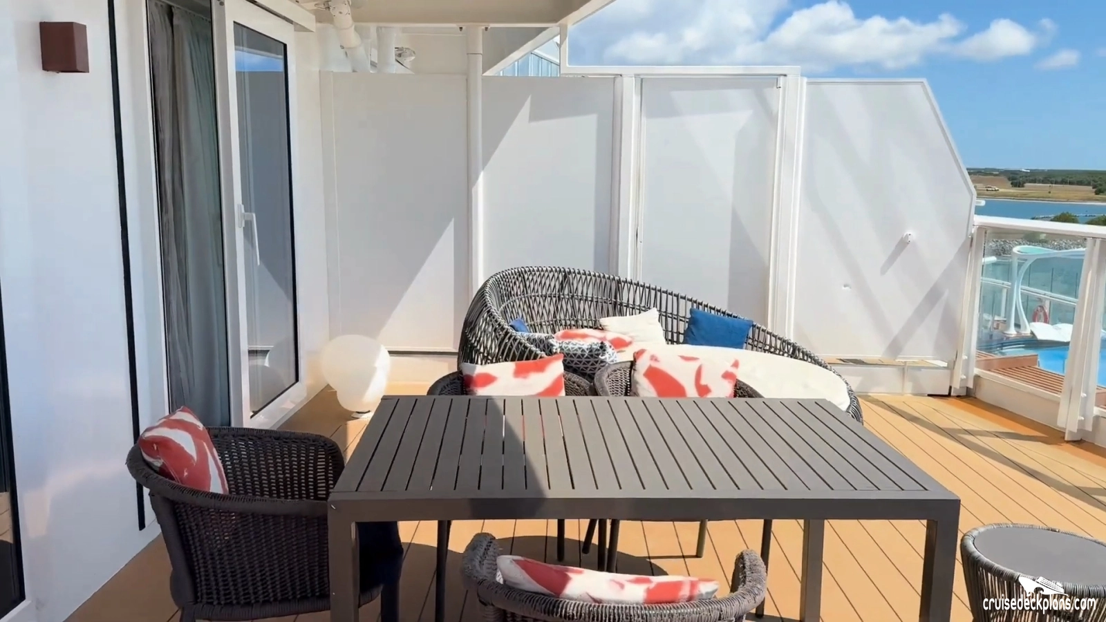 - Balcony has lounge bed, chairs and outdoor dining table.