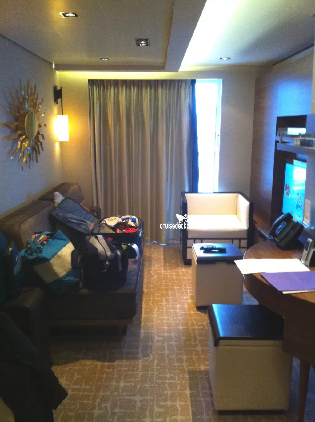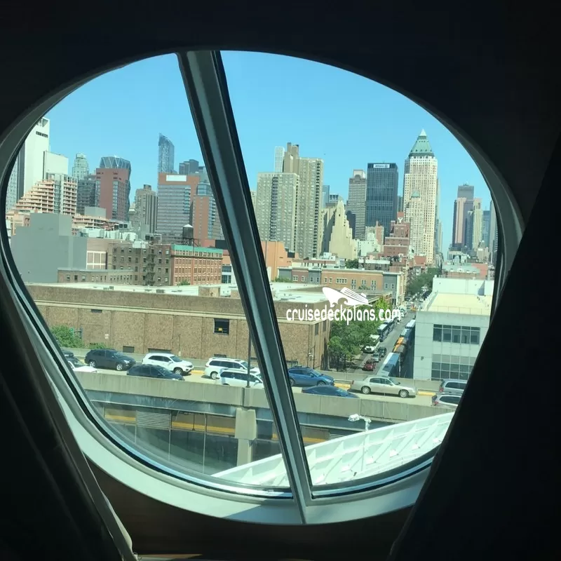 - Porthole window in bedroom overlooking bow of ship and small side balcony