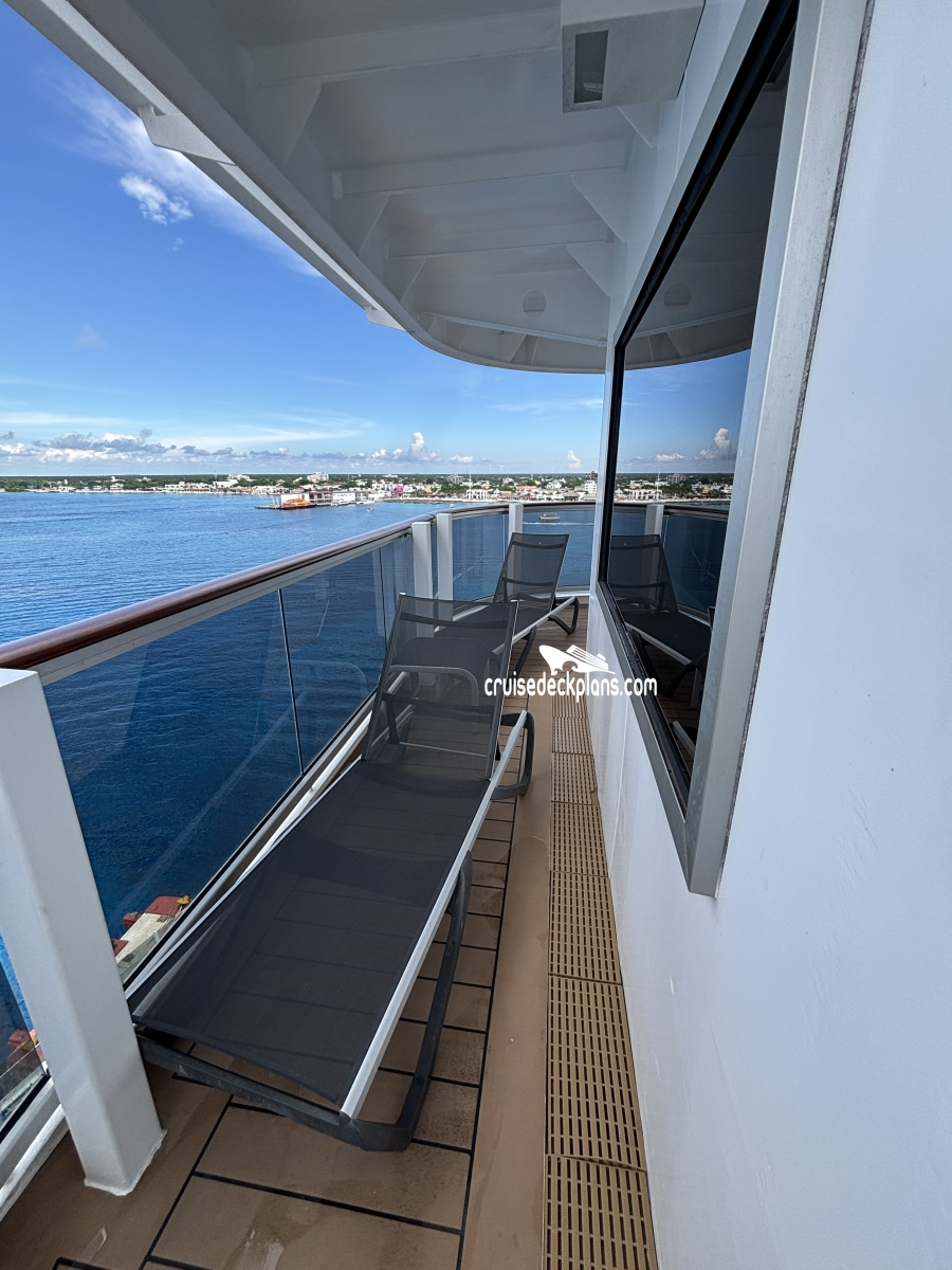 Diagram shown above represents S3 suites on deck 9 (except for aft facing suites) and those balconies are extra long and the balcony itself is about 172 square feet. Cabins with angled balconies are approx 215 square feet plus 80 square foot balcony.