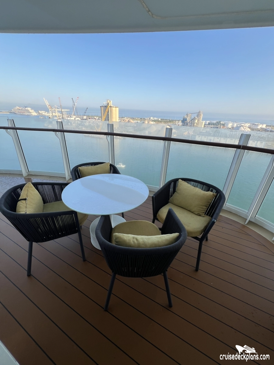 Concierge Service / Priority Check In / Priority Debarkation / Priority Tender Boarding / Reserved Show Seats / Dining in the Stateroom / Exclusive Lounge / Exclusive Full Breakfast Restaurant / Thick Cotton Robes / Pillow Menu / All day access to Coastal Kitchen on Icon, Oasis and Quantum class ships / Specialty Bottle Water / 1 day pass to Spa Thermal Room / Luxury Bath Amenities / Luxury Pillowtop Matress / Suite only sun deck / Suite only beach on private island
