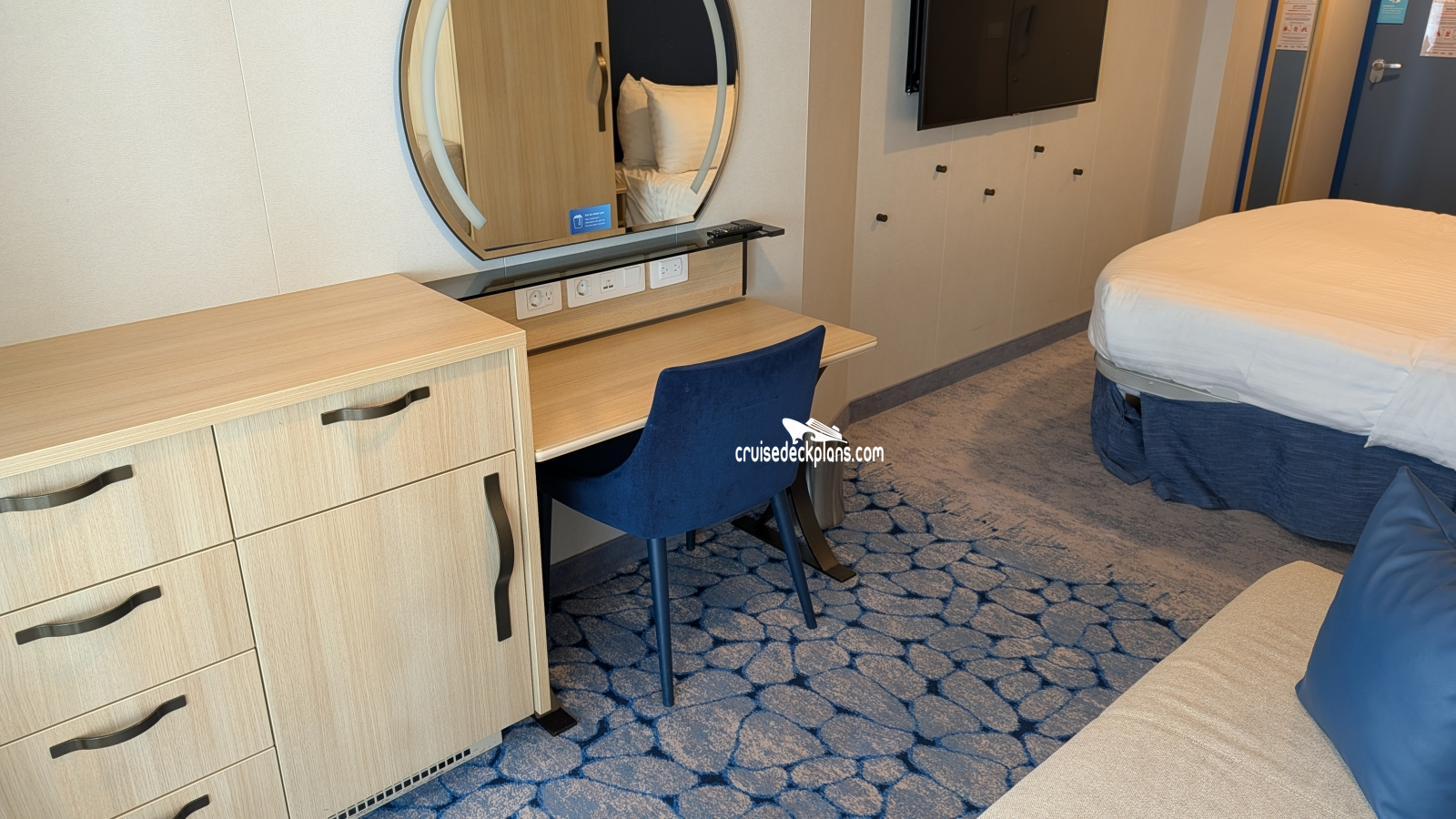 - Expanded living area with desk, drawer space, vanity