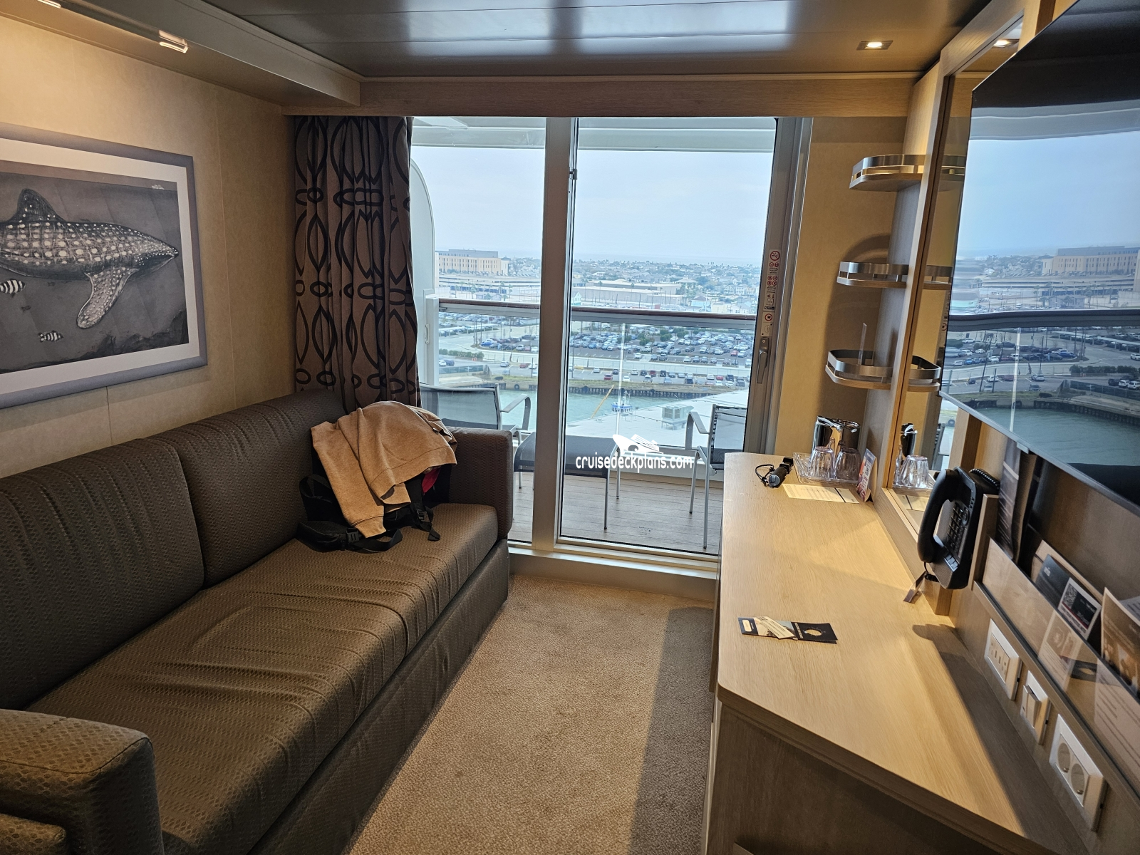 In some cabins the bed will be close to the balcony door. In other cabins the couch will be close to the balcony door.