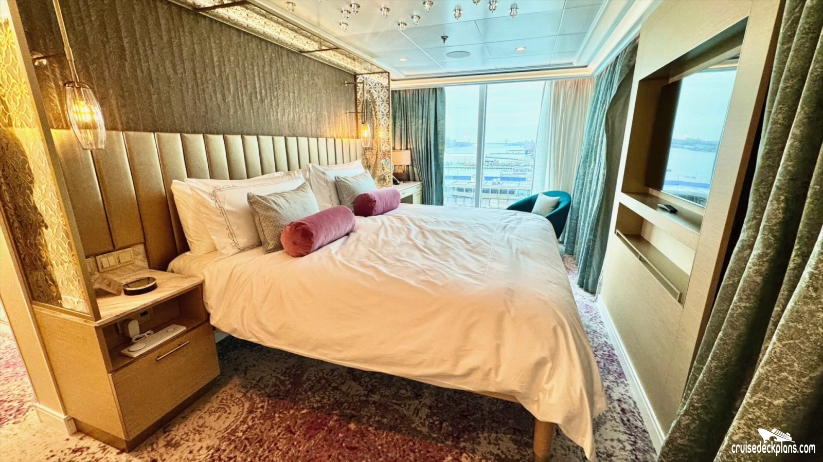 Concierge Service / Priority Check In / Priority Tender Boarding / Dining in the Stateroom / Exclusive Lounge / Priority Dining Reservations / Exclusive Outdoor Lounge / Thick Cotton Robes / Pillow Menu / Sealy Posturepedic Euro-top mattress / Frette 100% Egyptian cotton linens / 2 LCD 42 inch HD flat screen Tvs / Ipod docking station / Enhanced line of H20 Plus spa products / Media library / Pre-arrival concierge services /