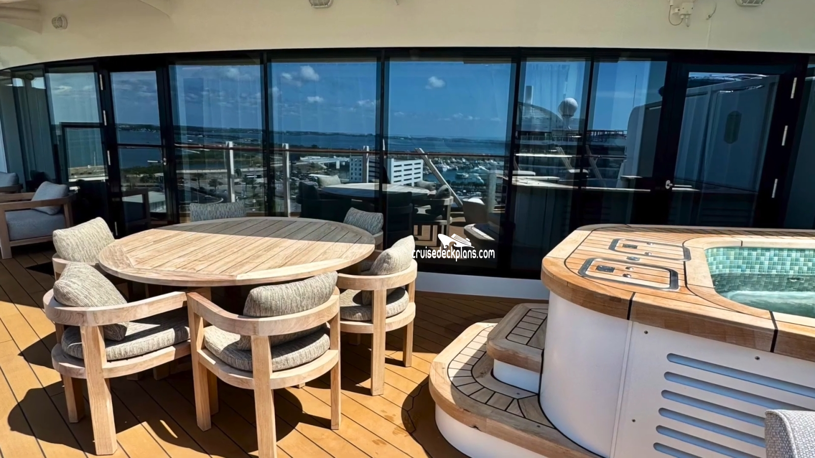 Concierge Service / Priority Check In / Priority Tender Boarding / Dining in the Stateroom / Exclusive Lounge / Priority Dining Reservations / Exclusive Outdoor Lounge / Thick Cotton Robes / Pillow Menu / Sealy Posturepedic Euro-top mattress / Frette 100% Egyptian cotton linens / 2 LCD 42 inch HD flat screen Tvs / Ipod docking station / Enhanced line of H20 Plus spa products / Media library / Pre-arrival concierge services /