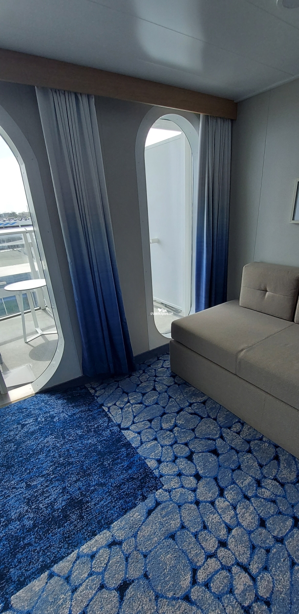 Some balconies up to 80 square feet. Category 1C (was D1) and 2C (was D2) has larger balconies. Some cabins are laid out with the bed near the balcony, others have the sofa near the balcony. Triple and Quad cabins have the sofa near the balcony. Layout changes every other cabin. Handicap cabins may have small chair bed instead of sofa bed. If there is more than two booked in cabin the chair bed is not recommended for adults.