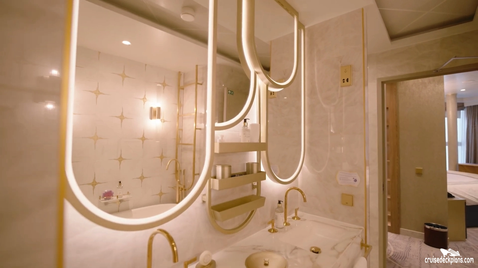 Concierge Service / Priority Check In / Priority Tender Boarding / Dining in the Stateroom / Exclusive Lounge / Priority Dining Reservations / Exclusive Outdoor Lounge / Thick Cotton Robes / Pillow Menu / Sealy Posturepedic Euro-top mattress / Frette 100% Egyptian cotton linens / 2 LCD 42 inch HD flat screen Tvs / Ipod docking station / Enhanced line of H20 Plus spa products / Media library / Pre-arrival concierge services /