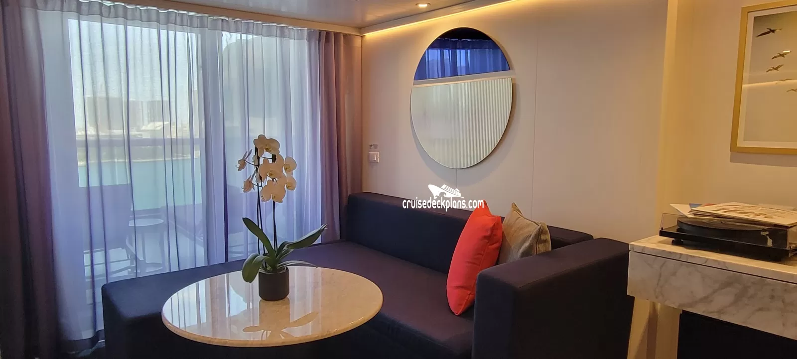 Scarlet Lady Gorgeous Suite cabin location, stateroom cabin videos, stateroom cabin pictures, floor plans, diagrams, stateroom features and perks. Cruisedeckplans.com also provides links to actual stateroom cabin pictures and videos on this page. You can see details and floor plans for all of Scarlet Lady's different stateroom cabin categories on the NEW cabins page.