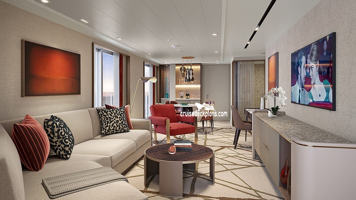 Butler Service / Concierge Service / Priority Check In / Priority Luggage Delivery / Dining in the Stateroom / Complimentary Shoe Shine / Welcome Champagne / Complimentary Mini-bar Setup / Exclusive Lounge / Priority Dining Reservations / Exclusive Outdoor Lounge / Complimentary Laundry / Thick Cotton Robes / King-size Prestige tranquility bed with 1,000 thread count linens / Refridgerated mini-bar with free and unlimited soft drinks and bottled water / Bulgari toiletries / Full-size bathtub / Signature belgian chocolates with nightly turndown service / DVD player / Wifi / Personalized stationary / Use of laptop computer with internet plan discounts / IPad on request / Complimentary tote bag / Cashmere lap blankets / Entertainment system and media library / Gourmet evening canapes / Bulgari gift set / Choice of daily newspaper /