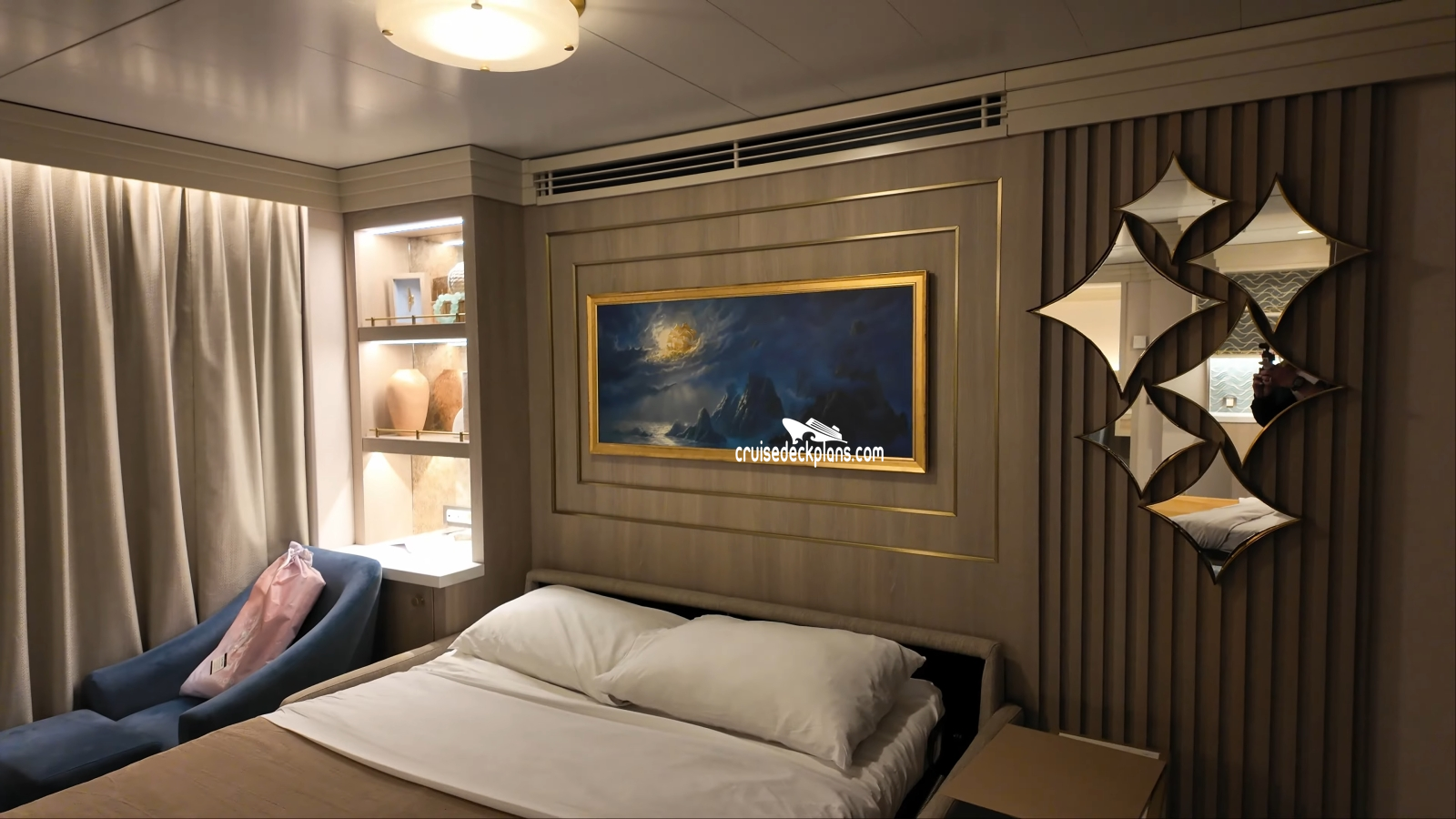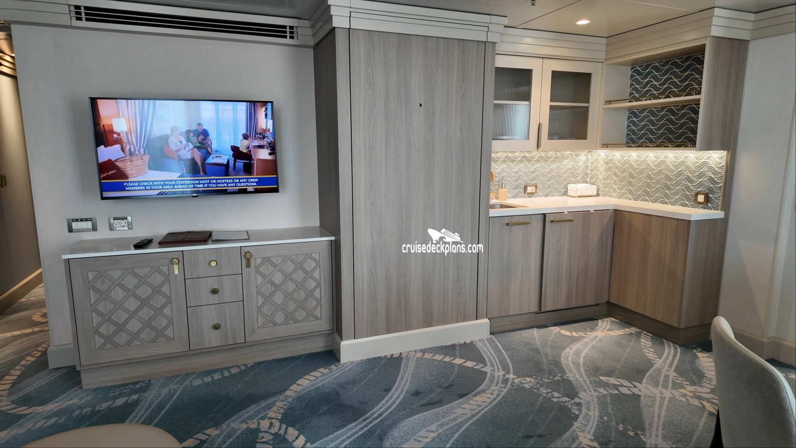 Concierge Service / Priority Check In / Priority Tender Boarding / Dining in the Stateroom / Exclusive Lounge / Priority Dining Reservations / Exclusive Outdoor Lounge / Thick Cotton Robes / Pillow Menu / Sealy Posturepedic Euro-top mattress / Frette 100% Egyptian cotton linens / 2 LCD 42 inch HD flat screen Tvs / Ipod docking station / Enhanced line of H20 Plus spa products / Media library / Pre-arrival concierge services /